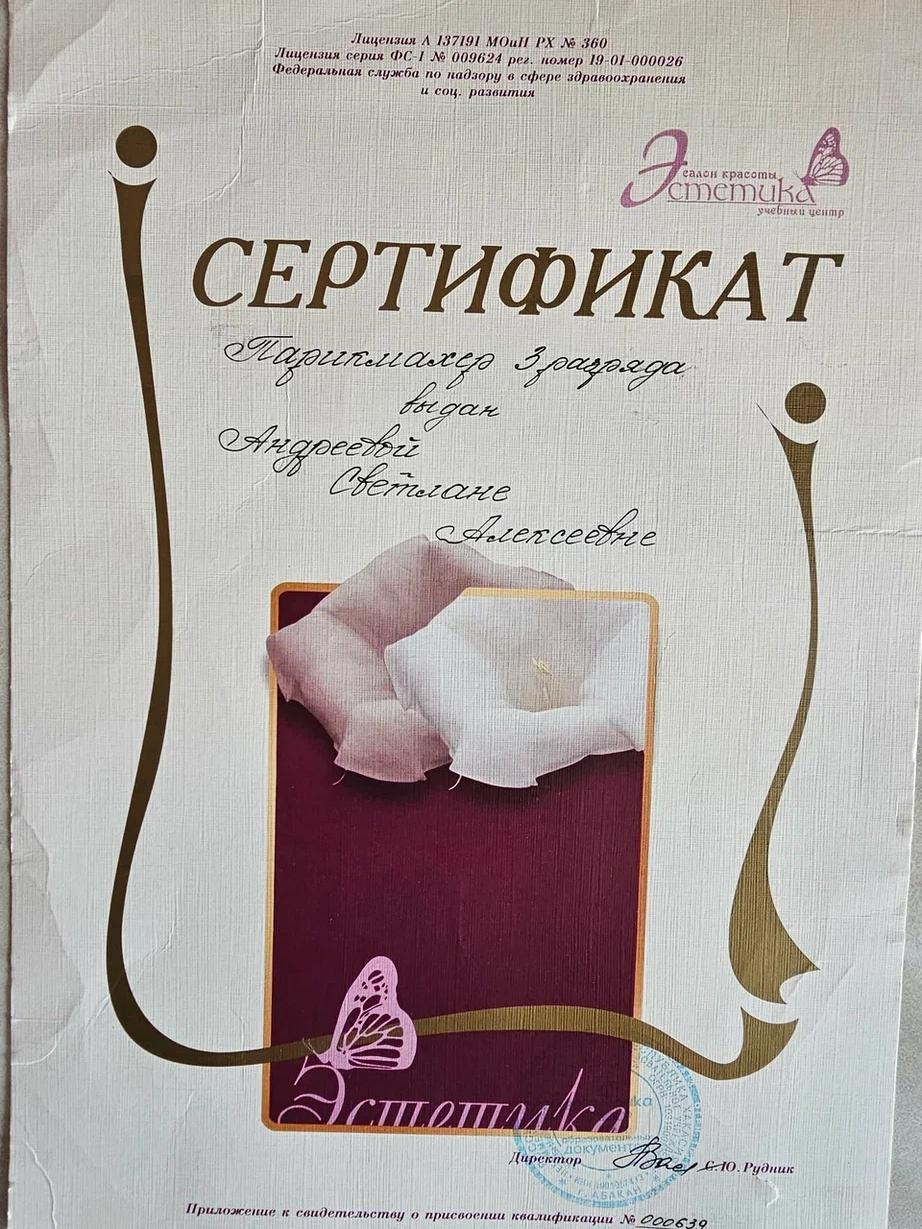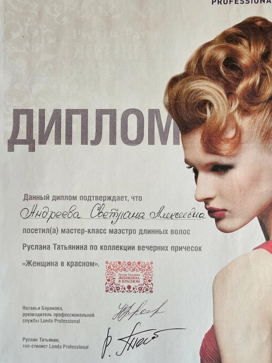 Высшее образование Светланы Андреевой — педагогическое. Окончила ХГУ им. Катанова в 1998 году по специальности «Воспитатель логопедической группы». Благодаря навыкам преподавания автор умеет простым языком рассказать о сложных вещах. Эти профессиональные умения отмечают большинство выпускников авторских онлайн-курсов парикмахера в «Школе игровой колористики».