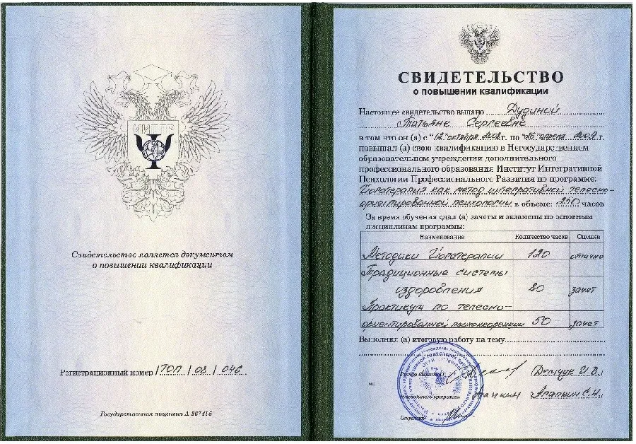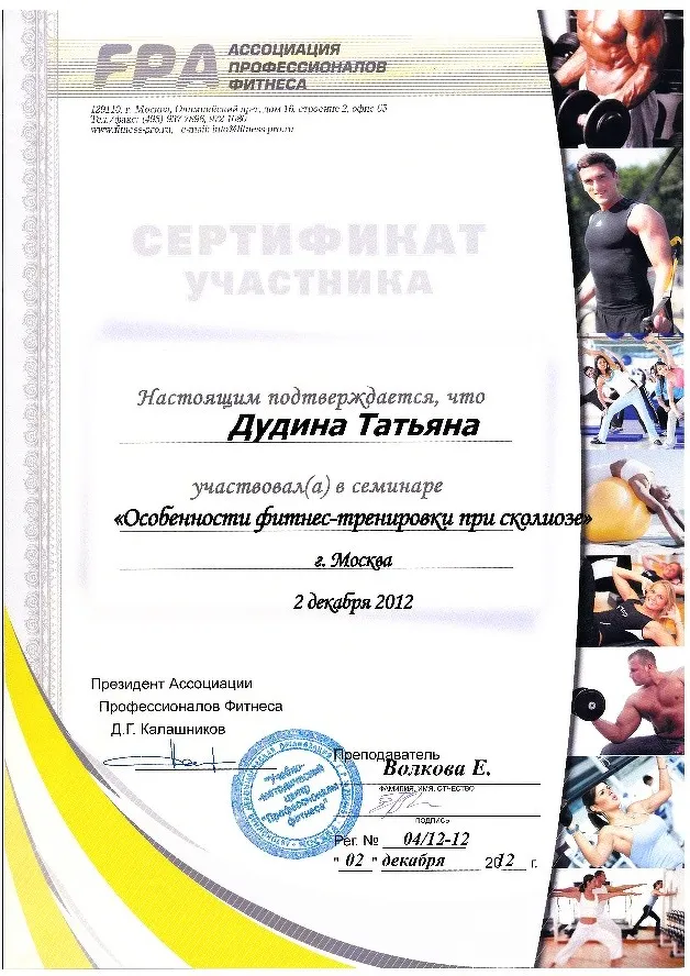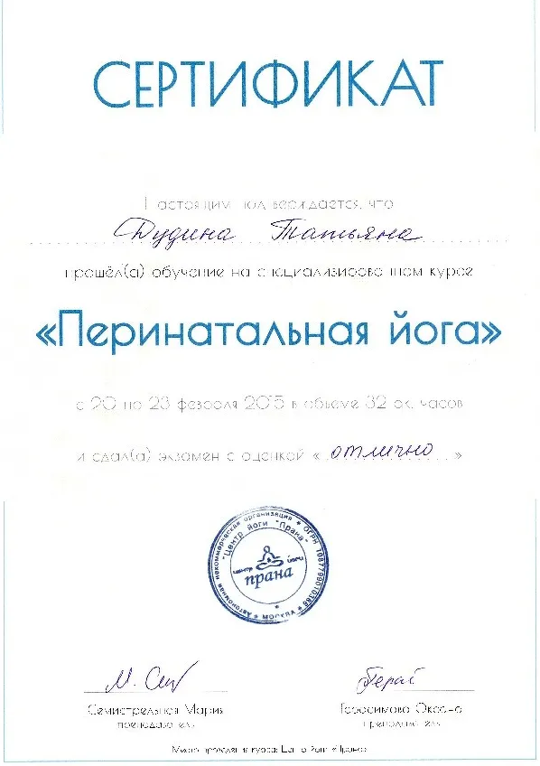 Закончила курсы: «Поясница». «Стопы», «Тазобедренные суставы», «Колени», «Таз и крестцово-подвздошный сустав», «Поясница», заканчиваю Курс «Грудная клетка»