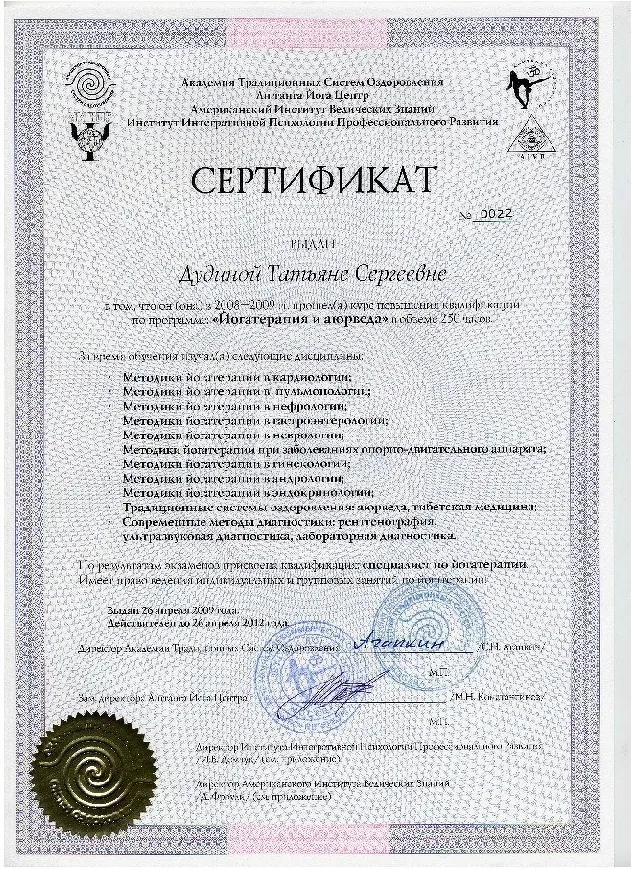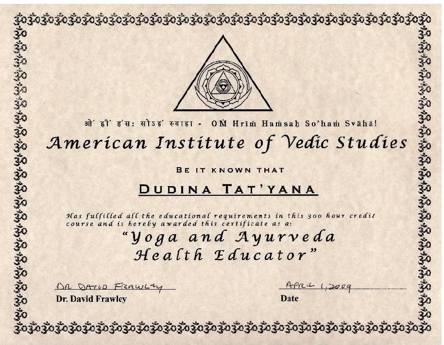 Татьяна Дудина посвятила себя вопросу восстановления здоровья с юных лет. Тогда она начала заниматься йогой, покупала все доступные книги и ходила на различные семинары, курсы и конвенции по йоготерапии. Дедушка привил ей любовь к этой восточной практике и помог понять, что йога — это больше, чем занятия, а преподавание — крайне ответственное дело. Чтобы стать хорошим специалистом, необходимо освоить методики и направления йоги, довести техники до автоматизма. Постоянно учиться и самосовершенствоваться, чтобы советы и наставления помогали решать проблемы со здоровьем, а не приносили вред людям.