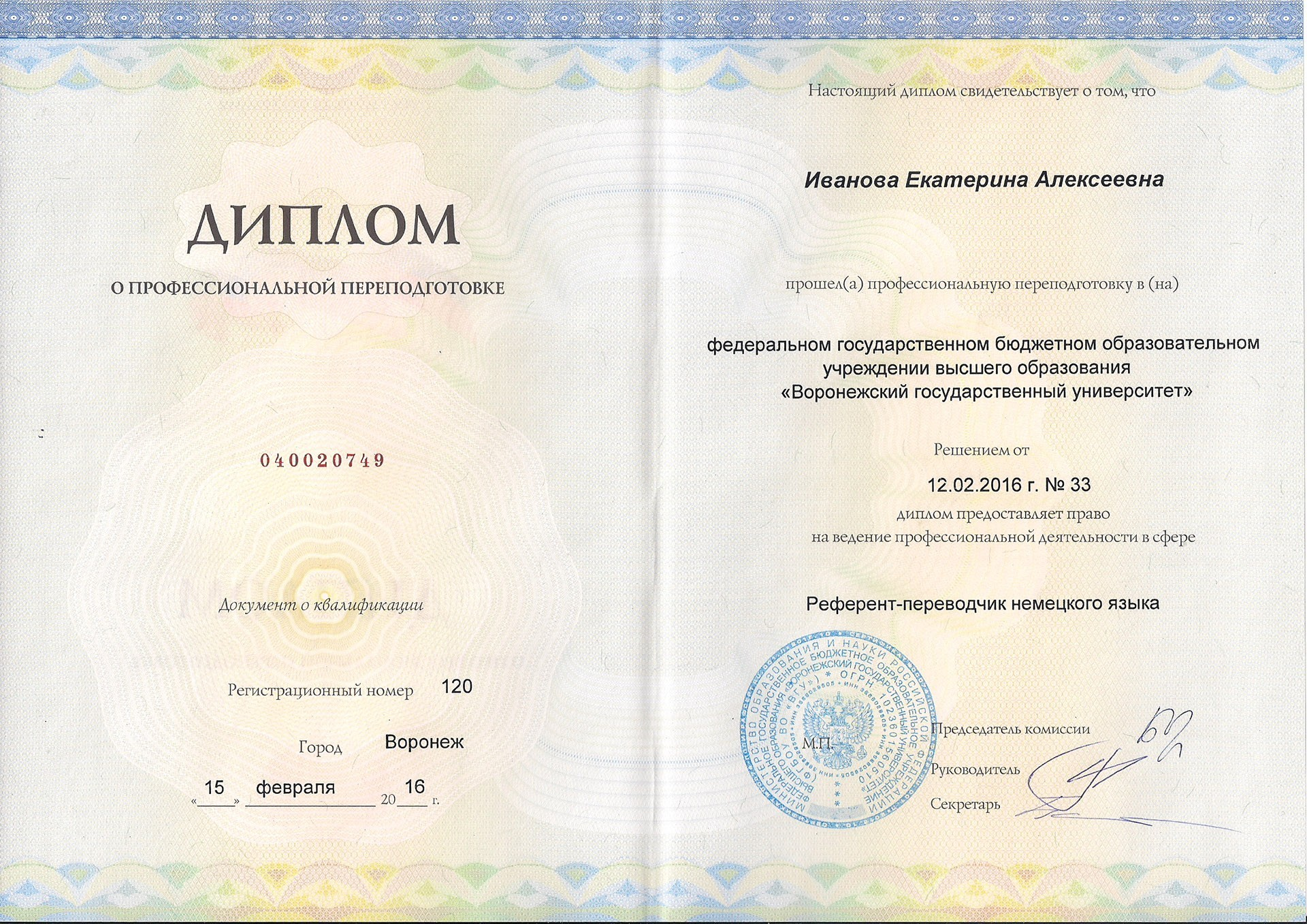 ФГБОУ ВО «Воронежский государственный университет» диплом от 12.02.2016. Референт-переводчик немецкого языка