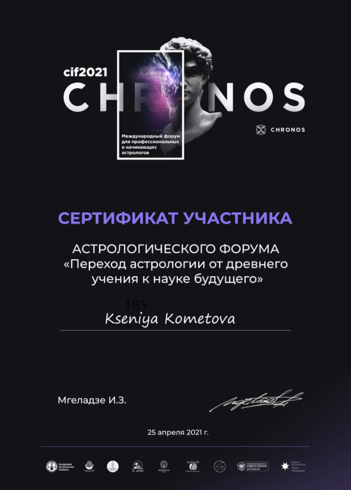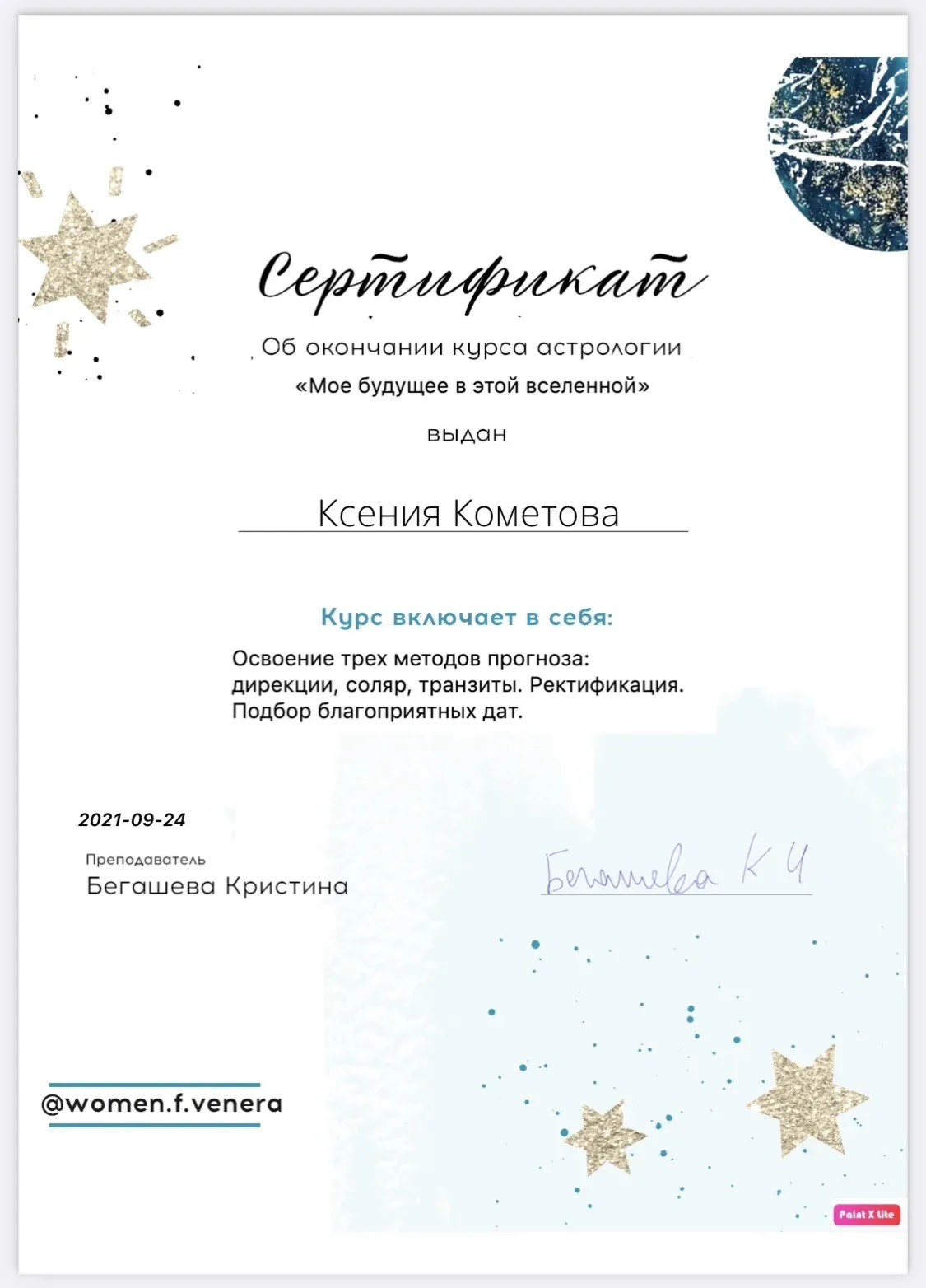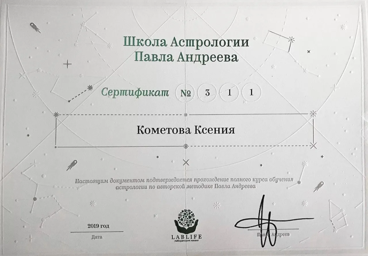 На сегодня Ксения Кометова провела свыше 3 тыс. астрологических консультаций и обучила расшифровке натальных карт с нуля более 1 тыс. человек. Выпускники ее курсов уже зарабатывают на своих собственных консультациях.