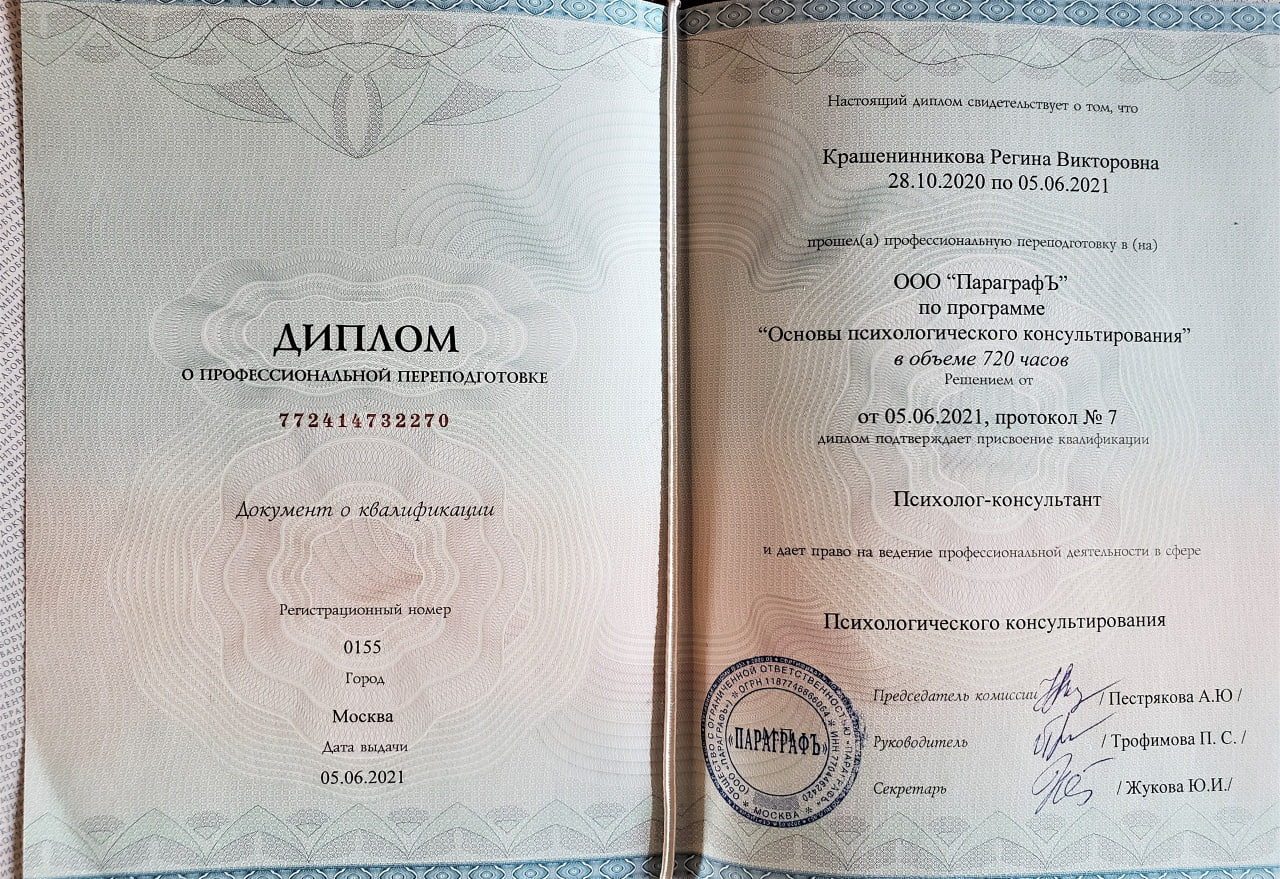- 2021 год — Институт новой психологии Анны Матари, программа «Основы психологического консультирования».