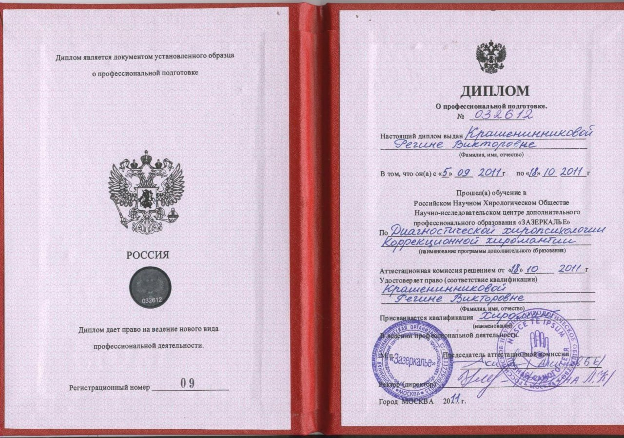 - 2011 год — Научно-исследовательский центр ДПО «Зазеркалье», специальность «Коррекционная хиропсихология».