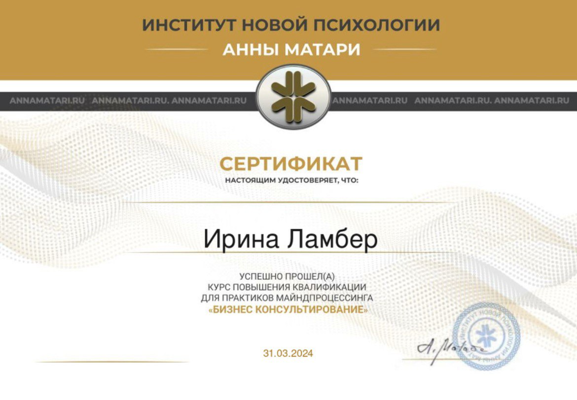 Первое высшее Иры Ламбер — экономическое. Работала финансовым директором в крупных компаниях. После неудачного инвестирования и болезни близких решила сменить сферу деятельности. Обучилась на психолога и поняла, что хочет помогать людям развиваться духовно. Открыла собственную школу с курсами о том, как изменить жизнь к лучшему.