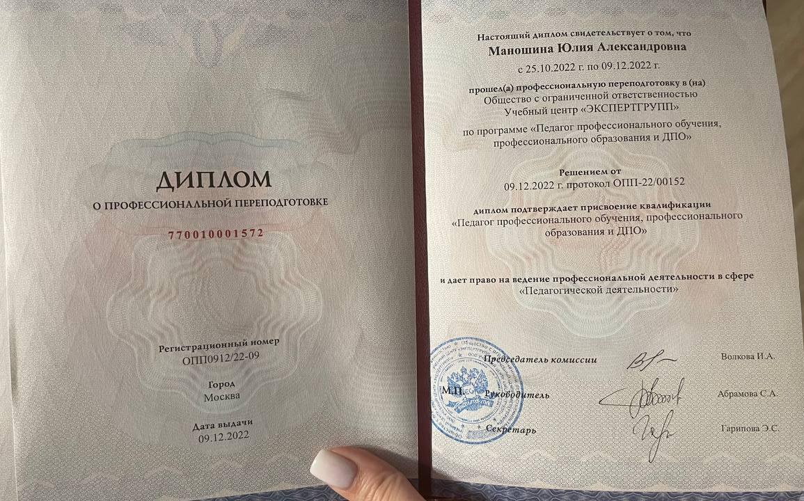 Юлия Маношина постоянно обучается, посещает семинары, курсы и практикумы. Вложила в свою голову знаний уже более чем на 1 500 000 ₽.