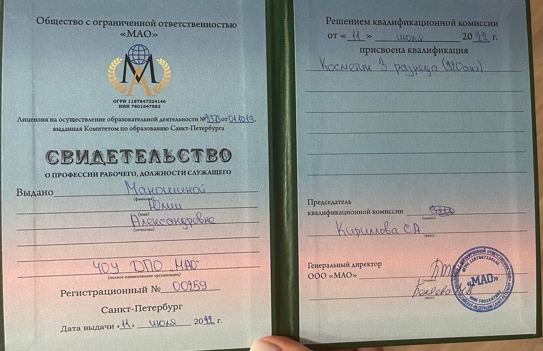 Вуз: ЧОУ ДПО МАО '22. Квалификация: косметик 3-го разряда. -