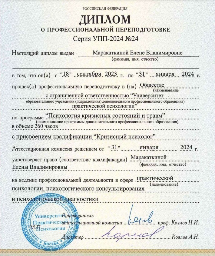 Вуз: Университет практической психологии '24, кризисный психолог -