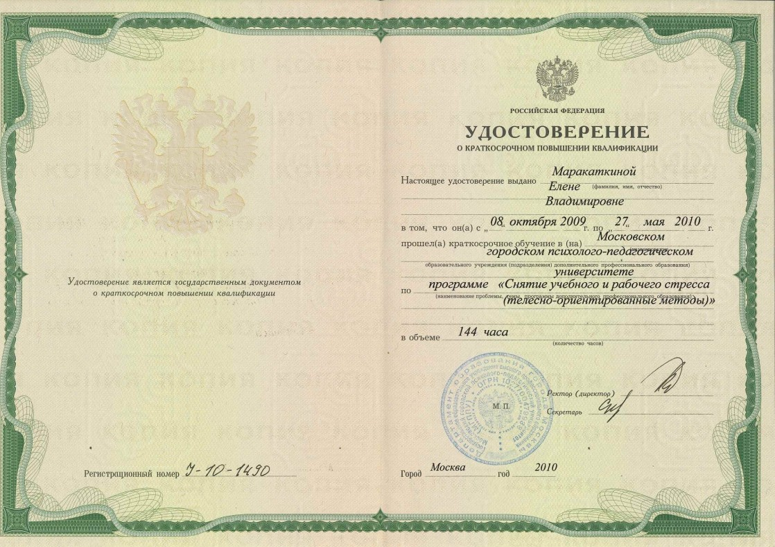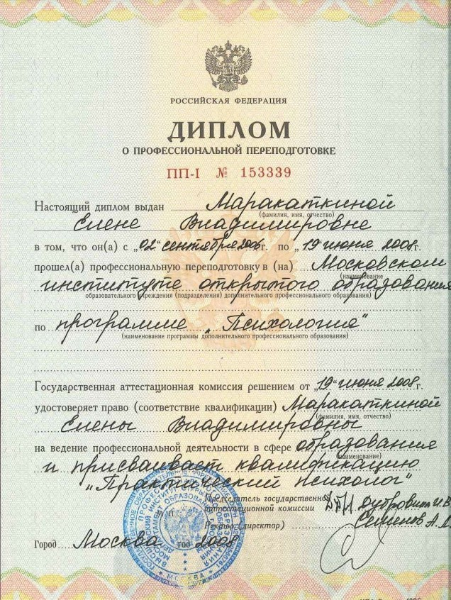 - 2008 год — Московский институт открытого образования, практический психолог.