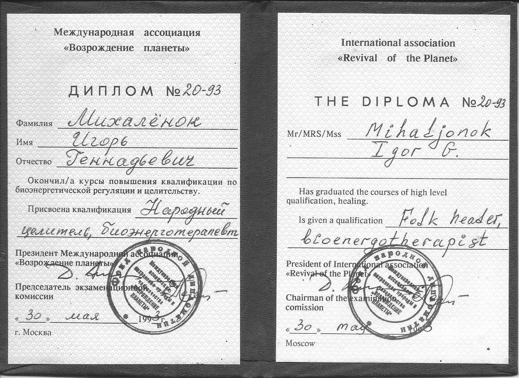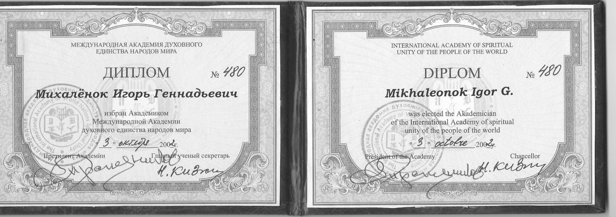 Более 19 лет - Академик Международной академии Духовного Единства Народов Мира.