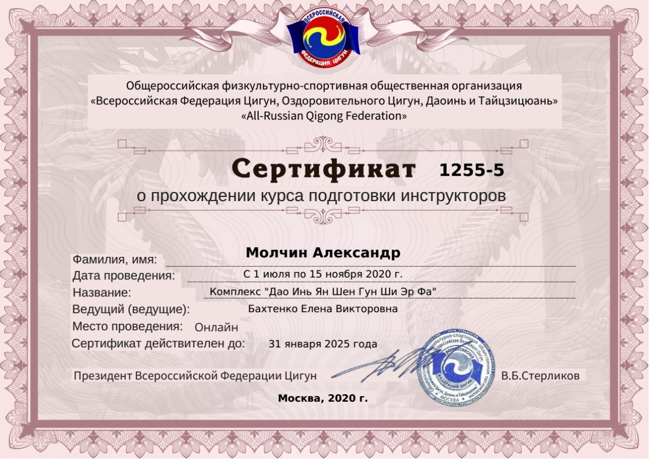Всероссийская Федерация Цигун, Даоинь и Тайцзицюань. Обучение на курсах инструктора и членство в федерации. С 2019 по наст.вермя.