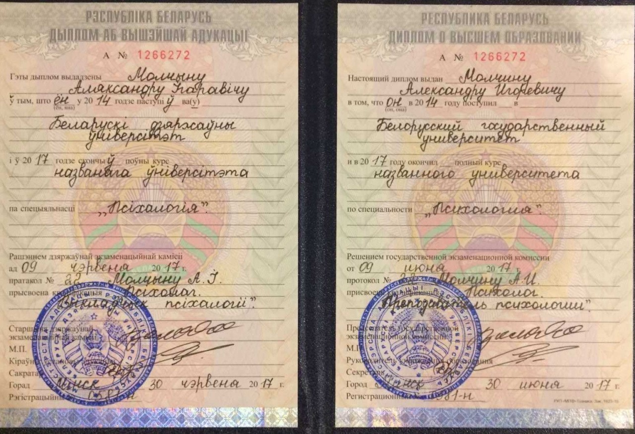 БГУ, Факультет Философии и социальных наук. Специализация, Медицинская Психология. 2014г. -
