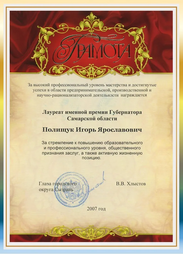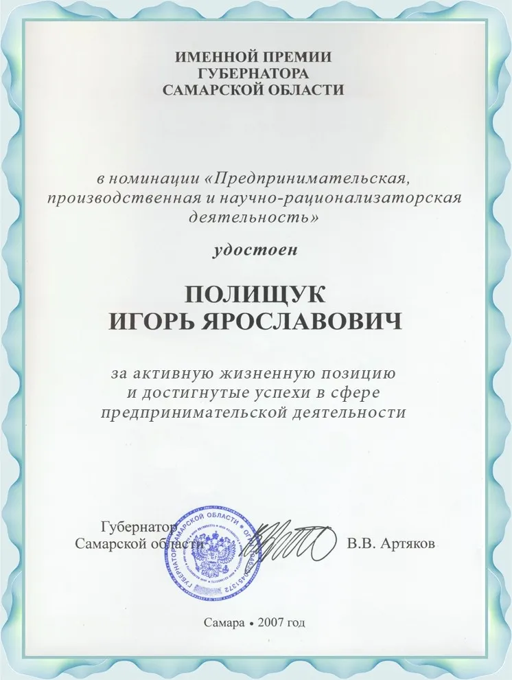 Лауреат именной премии Губернатора Самарской области, в номинации «Предпринимательская, производственная и научно-рационализаторская деятельность».По курсам и книгам Игоря Полищука обучилось более 1000 человек. -