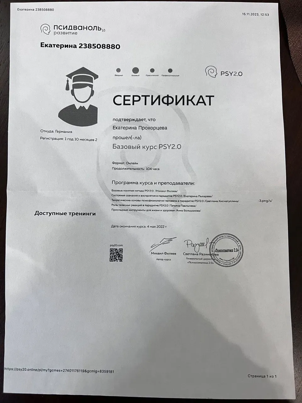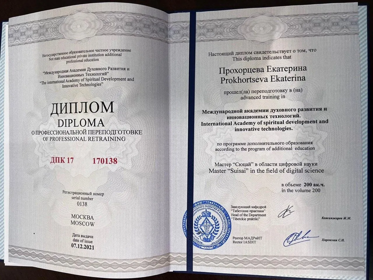 Диплом мастера «Сюцай», специалист по психосоматике нового поколения PSY2.0