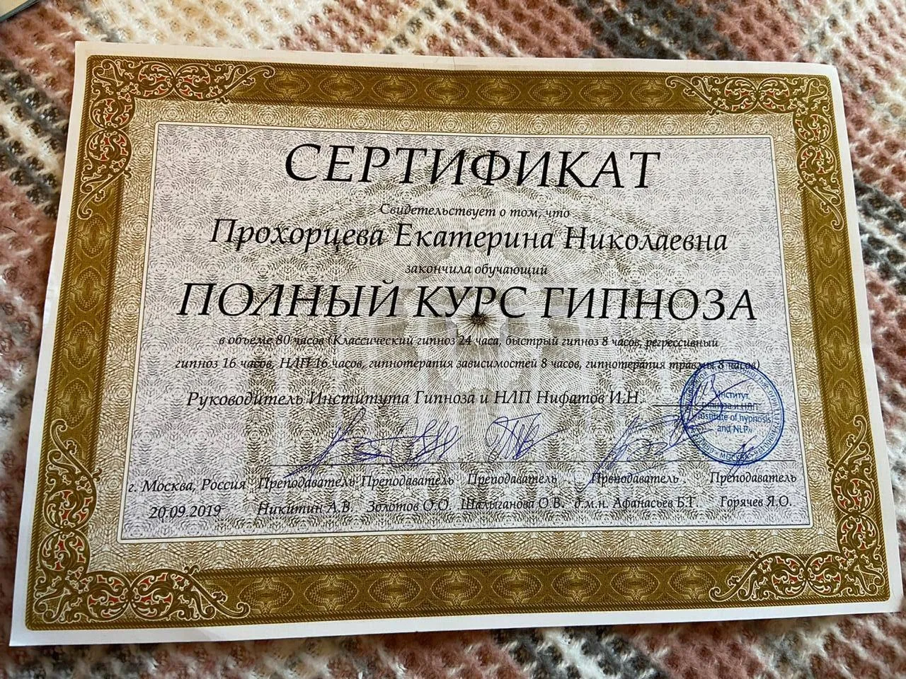 Екатерина на протяжении десяти лет изучала и практиковала трансперальные техники сознания в индийском университете. В России окончила два учебных центра: «Московский институт гипноза» и ИСиГр. Получила диплом мастера цифровой психологии «Сюцай» и специалиста по психосоматике нового поколения PSY2.0.