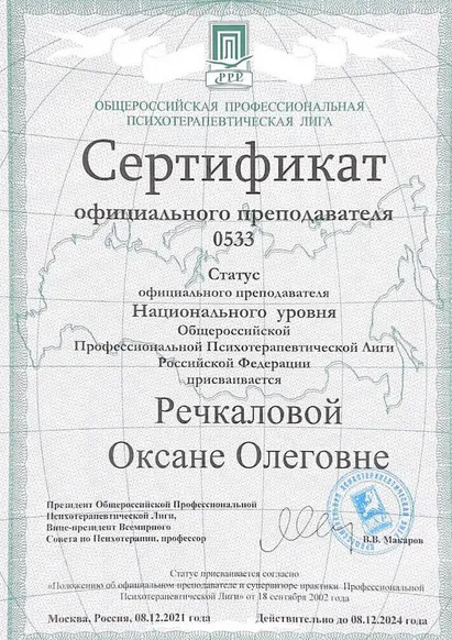 Клинический и практикующий телесный психолог Оксана Речкалова ведет профессиональную деятельность с 2009 года. Провела более 10 000 часов сессий в индивидуальном и групповом формате. Работала с детьми и подростками, была психологом-тренером в брачном агентстве, вела тренинги по переговорам, продажам, личной эффективности и навыкам управления. Последние несколько лет занимается частной практикой и обучает коллег в сфере психологии.