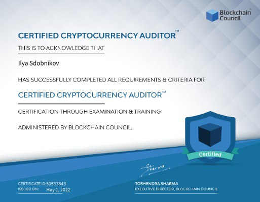 - 2022 год — Blockchain Council, специальность «Сertified cryptocurrency auditor».