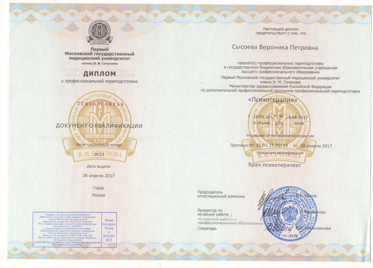 Вероника Сысоева имеет опыт работы свыше 10 лет. В арсенале психотерапевтические методы: МАК, тета-хиллинг, рациональная психотерапия. На консультациях дает советы, как справиться с депрессией, можно ли избавиться от панических атак, помогает с душевной болью, страхами, внутренними конфликтами, нарушениями сна и другими психосоматическими расстройствами.