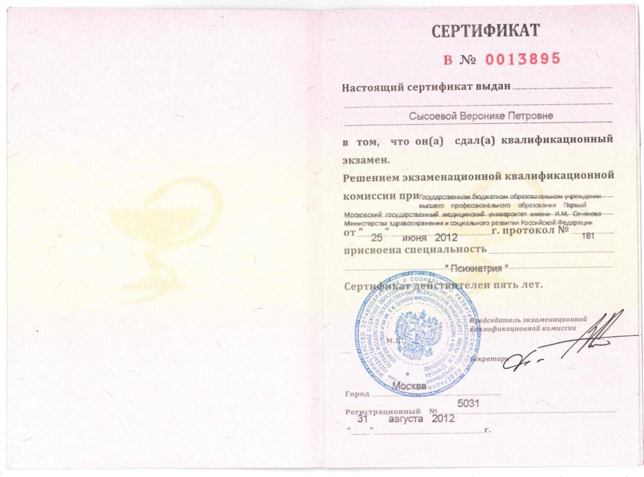 ОбразованиеВуз: Первый МГМУ, им. И.М. Сеченова '12, Специальность: Психиатрия