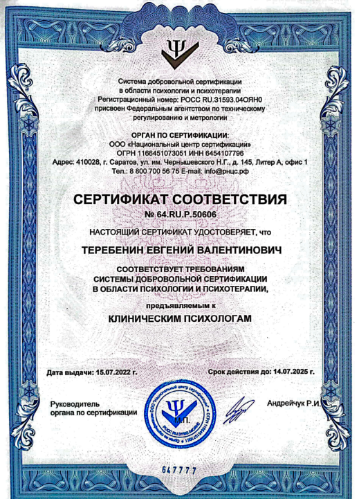 Евгений Теребенин — психолог с опытом более 20 лет в когнитивно-поведенческой терапии. Создал «Терапию Души» — авторский метод, который позволяет людям достичь целей через изменение восприятия и понимания причин проблем. В основе — знания в области клинической психологии, транзактного анализа и гештальт-терапии. За время практики эксперт помог 15 000+ человек разобраться с жизненными трудностями.
