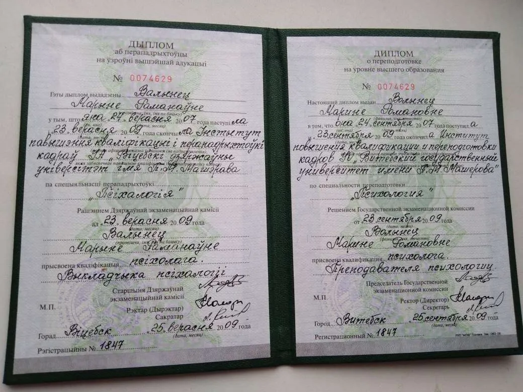 Вуз: Витебский педагогический университет им. Машерова '09, Специальность: Психология