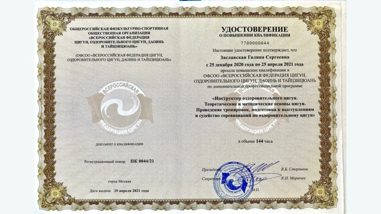 ОпытДипломированный специалист «Тренер преподаватель оздоровительного цигун».
