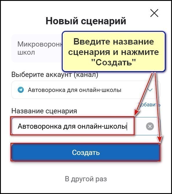 Шаг 3. Введите название нового сценария, в который будет перенесен шаблон и нажмите на кнопку «Создать».