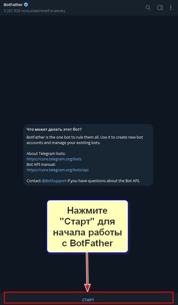Шаг 1. Найдите в поиске Телеграм бота BotFather и кликните по кнопке «Старт», чтобы приступить к работе.