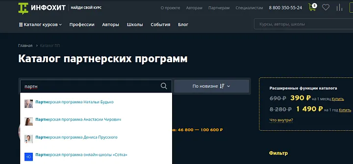 Маркетплейс онлайн-образования «ИнфоХит» создал для поиска новых партнёрок, отдельный каталог, а условия на которых они размещают у себя информацию часто совпадают с предложением для обычных партнёров: «Приведи партнера и получай 5% за все заказы с его продаж».
