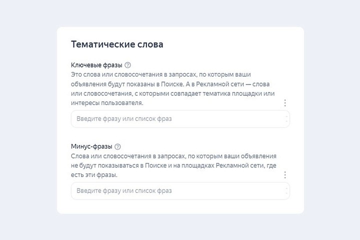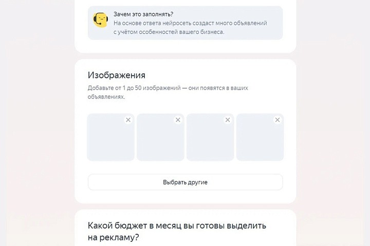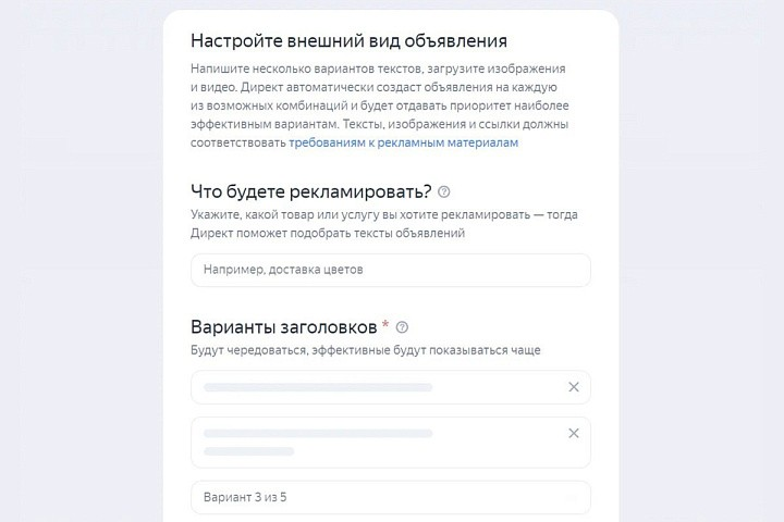 Продолжить настройку можно и без ссылки — если ответить на несколько вопросов о продвигаемом продукте, нейросеть Яндекса предложит автоматически сгенерированную рекламную кампанию, которую можно использовать без изменений или отредактировать.