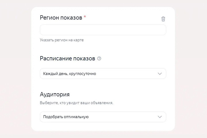 - задайте расписание — это важно для офлайн-бизнесов: если компания принимает заказы только днем, нет смысла транслировать рекламу ночью.