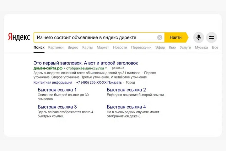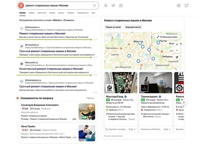 Этот тип объявлений появляется на странице с результатами поиска Яндекса. Система подбирает рекламу под конкретный запрос пользователя. Например, если человек ищет «ремонт стиральных машин», в первых строках он увидит информацию от компаний, предлагающих именно эту услугу [3].
