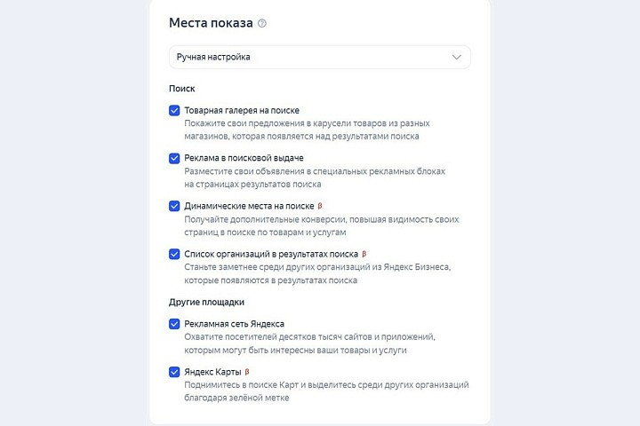 - Поиск, Рекламная сеть Яндекса и Карты (вариант по умолчанию).
