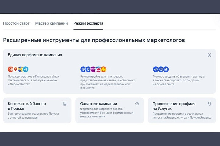 Это подход для тех, кто хочет добиться от рекламной кампании максимальной эффективности через тонкую настройку параметров. «Режим эксперта» позволяет выбрать стратегию, запустить геотаргетинг, управлять ставками.