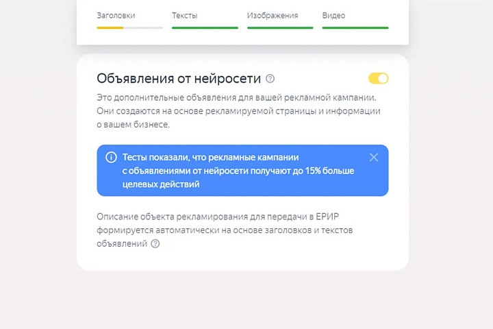 Если хотите разнообразить кампанию, оставьте активным ползунок «Объявления от нейросети». Искусственный интеллект автоматически сгенерирует тексты с упором на содержимое сайта и заданную тематику.