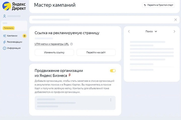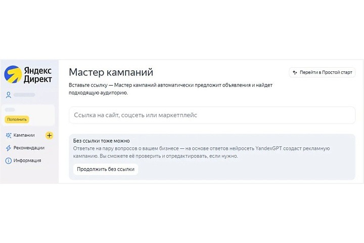 Если укажете ссылку на Telegram, соцсети или маркетплейс, сработает автоматическое переключение на «Мастер кампаний» — «Простой старт» эти площадки не поддерживает.