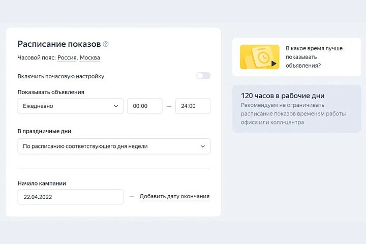 На старте лучше запускать объявления на весь день без ограничений, а после анализа — скорректировать по часам активности ЦА.