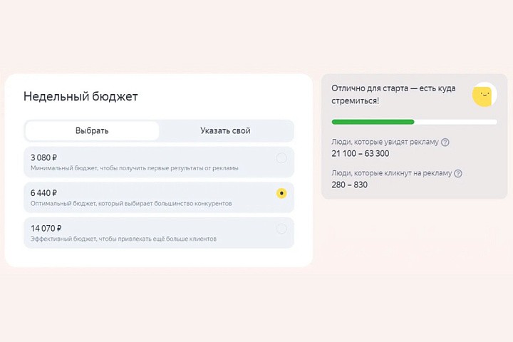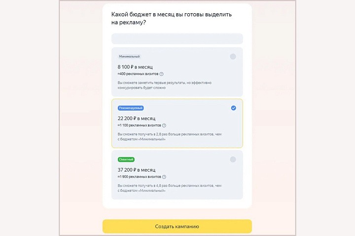 Точно рассчитать бюджет кампании невозможно. Все зависит от тематики, ключевых слов, формата рекламы, региона и уровня конкуренции. Но Яндекс рекомендует выделить для старта хотя бы 6000 ₽. При таком пополнении можно получить промокод на дополнительную сумму и воспользоваться бесплатной настройкой от специалистов.