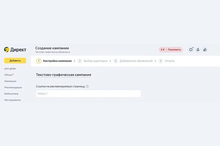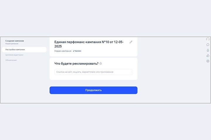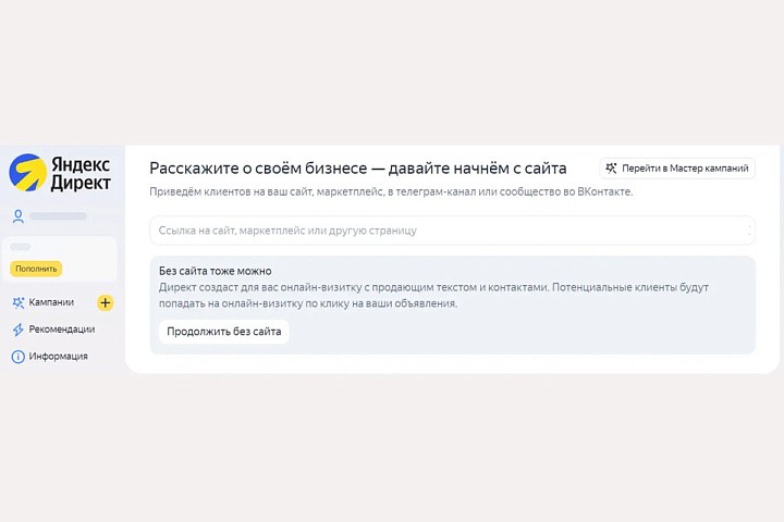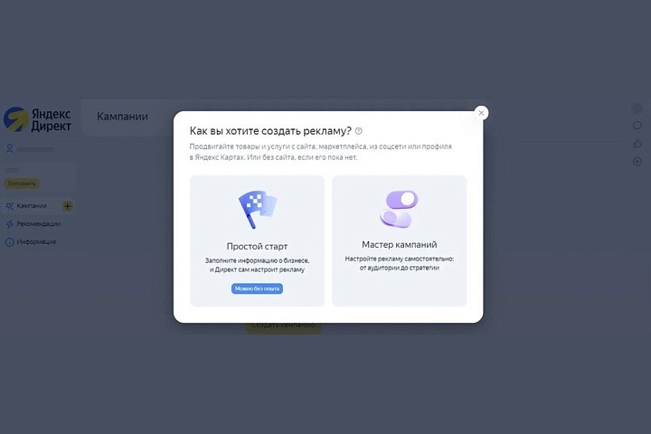На первом этапе Яндекс предложит создать рекламу через «Мастер кампаний». Это упрощенный способ запуска — система сама подскажет ключевые шаги: от выбора цели до загрузки объявления. Такой формат идеально подходит для новичков и чтобы протестировать идею с минимальными затратами.