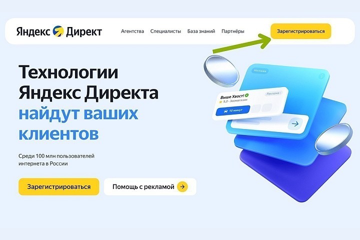 Авторизуйтесь в системе (войдите в Яндекс по логину/паролю), перейдите на сайт Директа и нажмите кнопку «Зарегистрироваться» [3].
