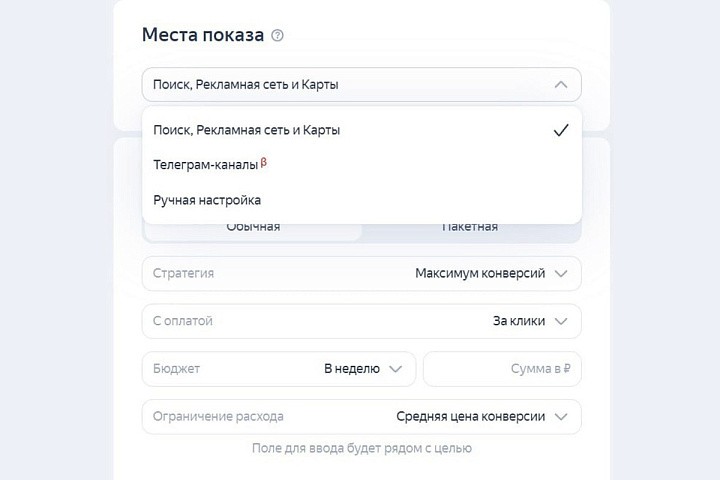 - Единая перформанс-кампания (рекламная кампания, охватывающая поиск, РСЯ, Яндекс Карты и телеграм-каналы).