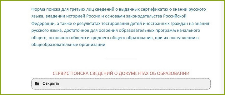 Шаг 2. Перейдите в сервис поиска. Прокрутите страницу вниз до надписи «Сервис поиска сведений о документах об образовании». Нажмите «Открыть».
