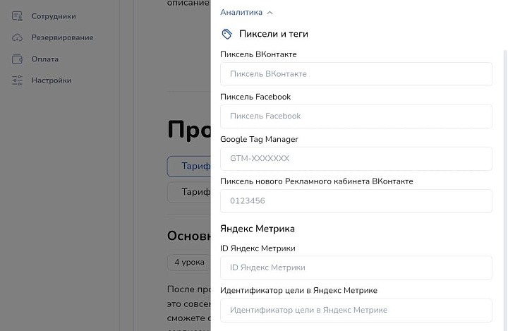 В строке «аналитика» вставьте пиксели «ВКонтакте», Facebook*, Tag Manager или «Яндекс Метрики». Так вы сможете отслеживать действия пользователей, оценивать эффективность рекламы и собирать данные для ретаргетинга.