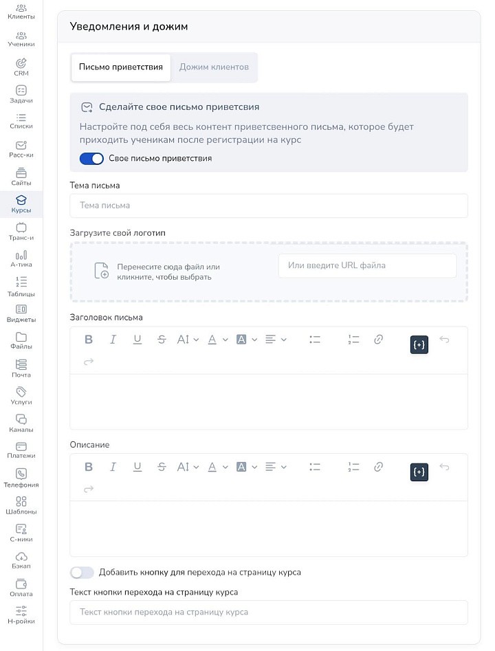 В разделе «Уведомления и дожим» настраивайте письма. Приветственное уходит студентам сразу после оплаты. Выбирайте шаблон или создавайте свою форму: