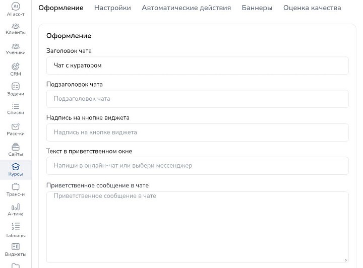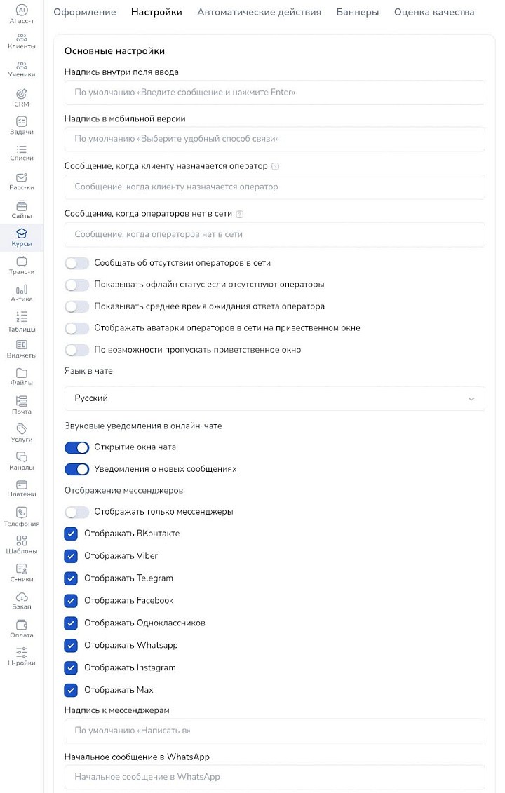 В настройках задайте текстовые подсказки, настройте автосообщения, включите уведомления, отображение мессенджеров и многое другое.