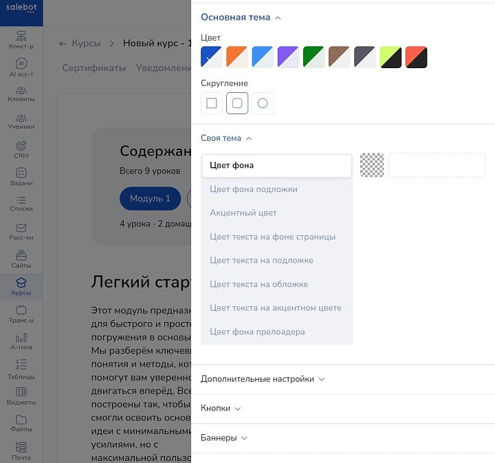 Во вкладке «внешний вид» настройте дизайн: цветовую схему, скругление блоков, ориентацию уроков и тарифов. Или создайте собственное оформление промостраницы, обложки и кнопок.