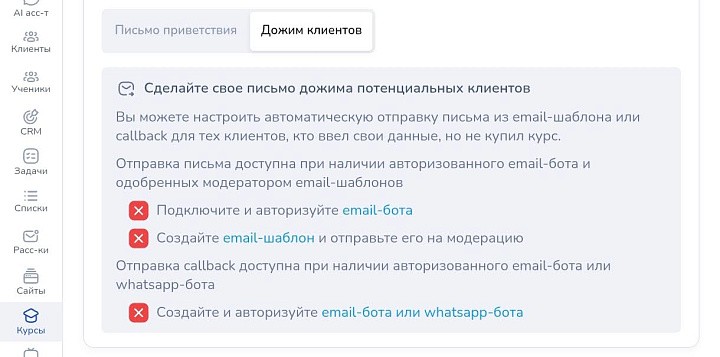 А еще можно создать письмо дожима. Допустим, когда клиент вводит данные на промостранице, но не покупает, можно сделать так, чтобы ему на почту приходили письма с напоминанием о возможности пройти обучение. Чтобы функция заработала, нужно подключить email-бота в разделе «каналы», создать письмо в email-шаблонах и отправить его на модерацию. После этого его можно использовать.