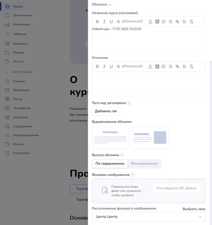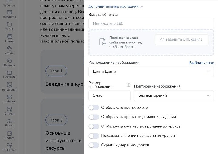 В дополнительных настройках прикрепите обложку, настройте ее высоту, расположение, размер, отображение прогресс-бара, число принятых домашних заданий и пройденных уроков, навигацию по курсам.