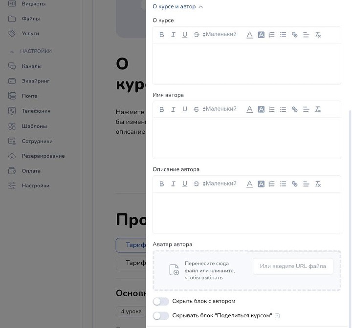 Затем укажите информацию о курсе, имя и описание автора, прикрепите его фото.