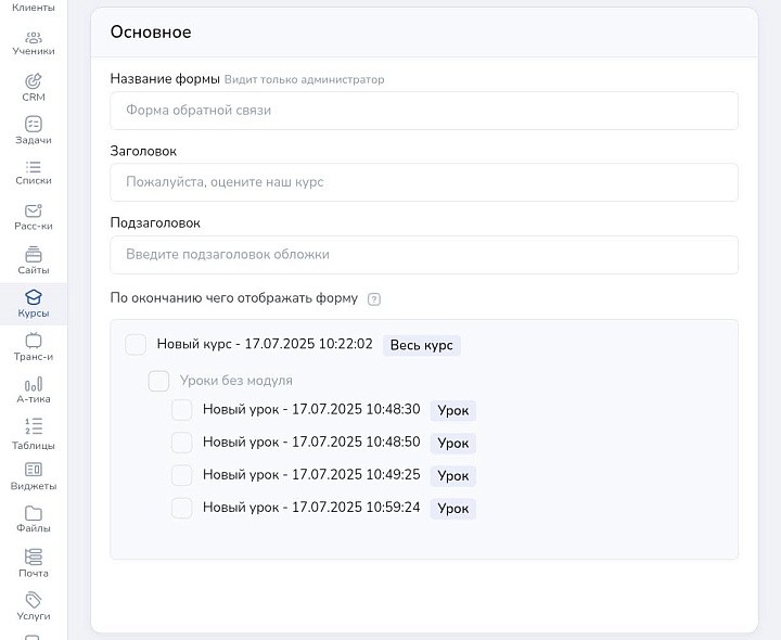 Укажите название формы, заголовок и подзаголовок, выберите, после каких занятий или модулей она появится.