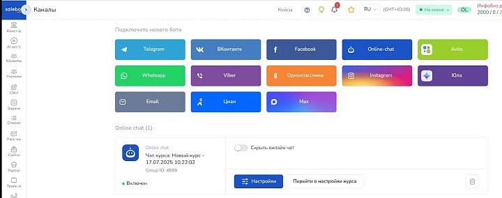 Также можно настроить отправку сообщений учащихся не в чат, а в мессенджер. Для этого сначала в левом меню выберите раздел «каналы», укажите нужный мессенджер или соцсеть. Так, если прикрепить Telegram, куратор сможет отвечать через сайт, а человек будет видеть сообщения в Telegram.
